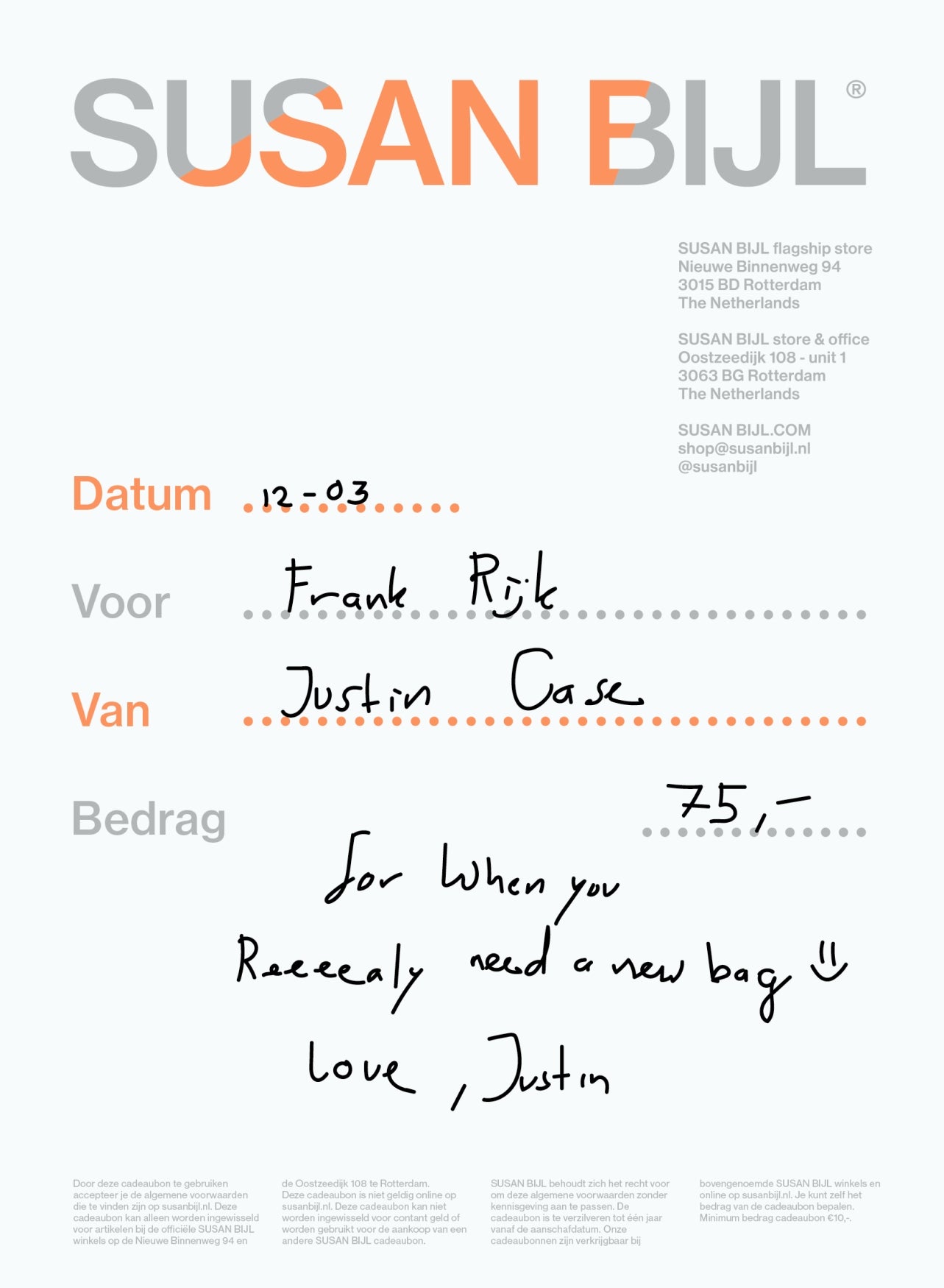 - This gift card is only valid in our SUSAN BIJL stores in Rotterdam.